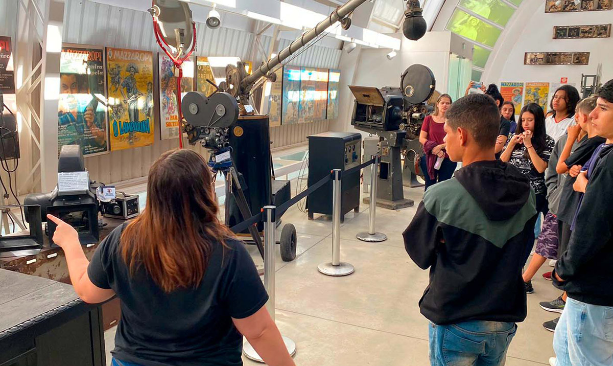 De forma interativa, os jovens participaram de duas atividades dinâmicas. Enquanto metade do grupo explorava a obra de Mazzaropi em visita guiada pelo museu, a outra metade mergulhava nos fundamentos do Cinema: Arte e Ciência. No final, os grupos trocavam de atividades, vivenciando uma experiência completa.